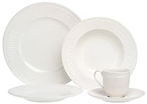 Italian Countryside has long been one of Mikasa's most popular patterns and is now available in a full set at a fabulous price. The white ironstone body has a soft filligree boarder and dresses up or down for any entertaining situation. This complete set is a service for eight including eight dinner plates salad plates rim soup plates teacups and saucers. It also contains one each 12" round platter round vegetable bowl covered sugar bowl and cream pitcher.